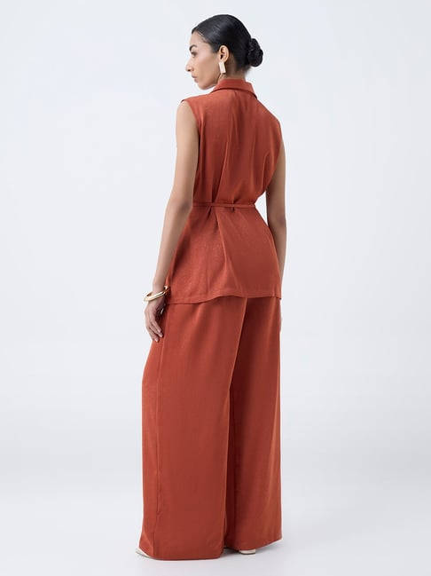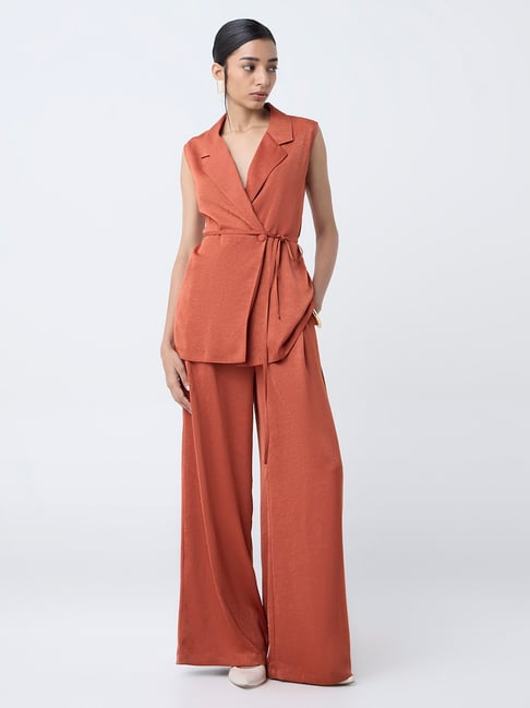 This orange textured blazer from Wardrobe is designed with a notched collar and a sleeveless cut, secured at the front with a single button. The look is brought together with its belted addition, shaping a refined and modern silhouette.